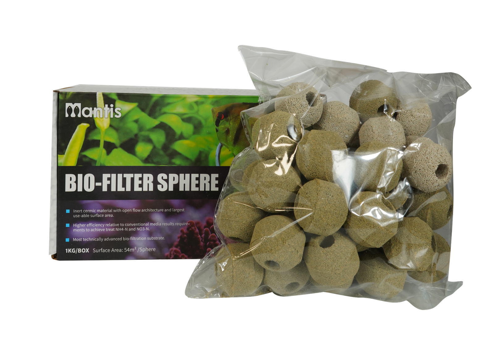 Las bioesferas nanotecnológicas de Mantis se crean utilizando tecnología de tratamiento de aguas residuales microbianas estabilizadas con filtro aireado biológico (W-BAF). Esta tecnología patentada se forma en perlas de cerámica inertes que se pueden colocar en una bolsa de malla y arrojar a su sump o compartimiento de filtro para la filtración del acuario. Cada esfera tiene un área de superficie ultra alta de 580 pies cuadrados, proporcionando un amplio espacio para la colonización por cepas de bacterias beneficiosas que pueden trabajar para reducir los nitritos, nitratos y amoníaco de forma natural.Características técnicas